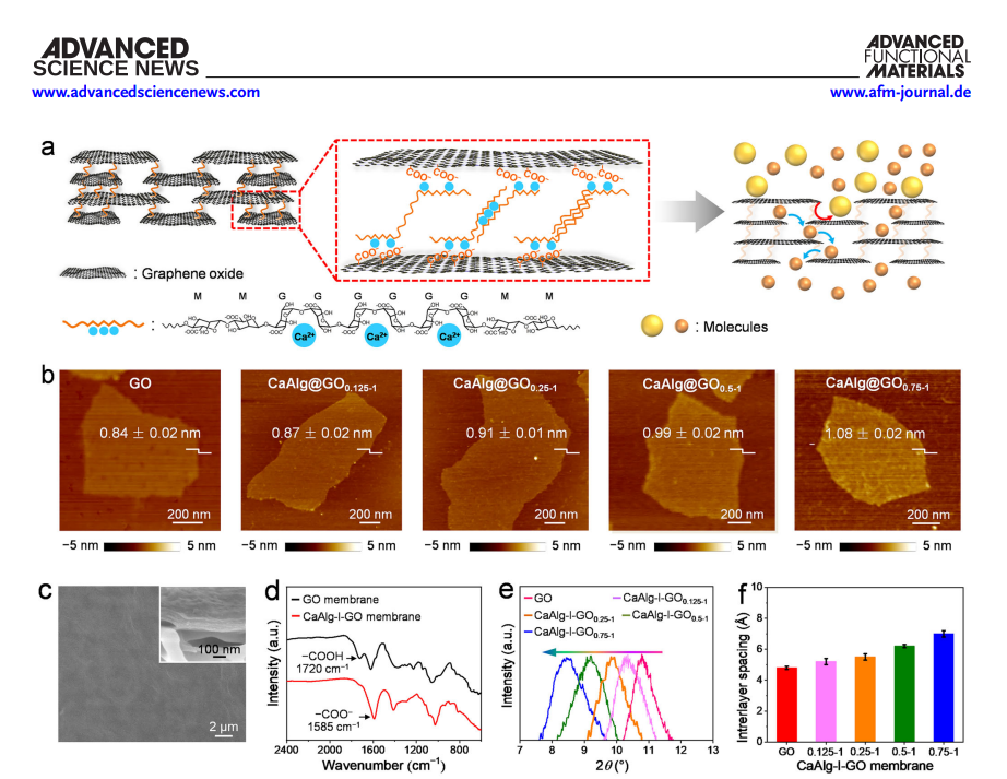 苏州大学靳健教授、 中国科学院苏州纳米技术与纳米仿生研究所高守建副研究员团队提出一种创新策略:通过插层水合海藻酸钙(CaAlg)到GO膜中,利用其水合链自发伸展特性,实现了层间距的亚埃级(CaAlg插层GO膜(CaAlg-I-GO)的层间距可在6.84–10.73 Å范围内线性调节,对有机分子的截留率高达99%,并展现超高选择性(分子尺寸差1.9 nm时选择性达463)。该膜脱水后可快速恢复层间距,长期存储性能稳定,且因Ca²⁺与GO形成配位键,抗拉强度提升至410 MPa,在错流过滤中表现出卓越稳定性。相关论文以“ Sub-1 Å Precision Tuning Interlayer Spacing of Robust Graphene Oxide Membranes for High-Selectivity Molecular Sieving ”为题,发表在Advanced Functional Materials 上,论文第一作者为Shen Tong。