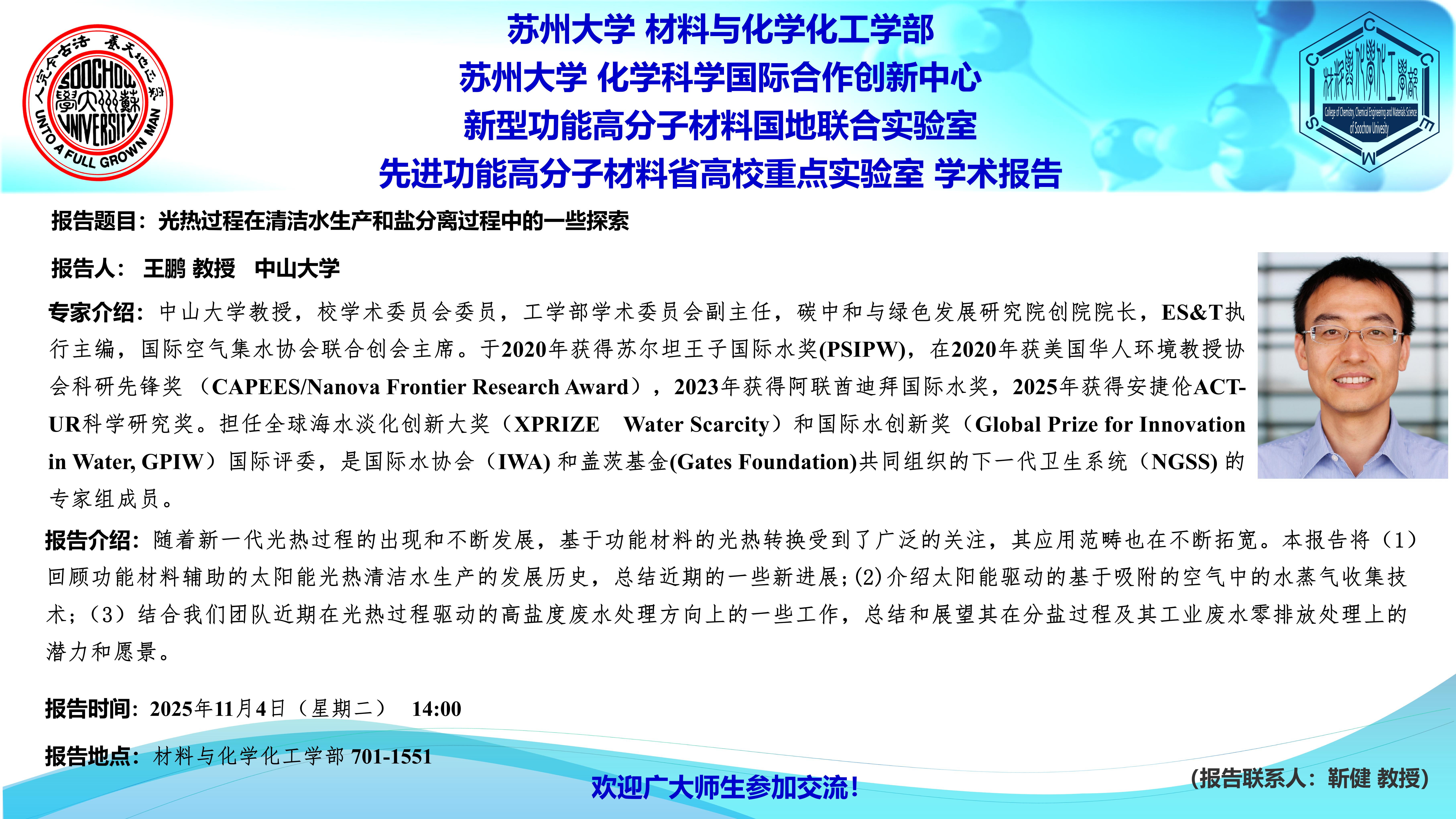 王鹏,中山大学教授,校学术委员会委员,工学部学术委员会副主任,碳中和与绿色发展研究院创院院长,ES&T执行主编,国际空气集水协会联合创会主席。于2020年获得苏尔坦王子国际水奖(PSIPW),在2020年获美国华人环境教授协会科研先锋奖 (CAPEES/Nanova Frontier Research Award),2023年获得阿联酋迪拜国际水奖,2025年获得安捷伦ACT-UR科学研究奖。担任全球海水淡化创新大奖(XPRIZE Water Scarcity)和国际水创新奖(Global Prize for Innovation in Water, GPIW)国际评委,是国际水协会(IWA) 和盖茨基金(Gates Foundation)共同组织的下一代卫生系统(NGSS) 的专家组成员。