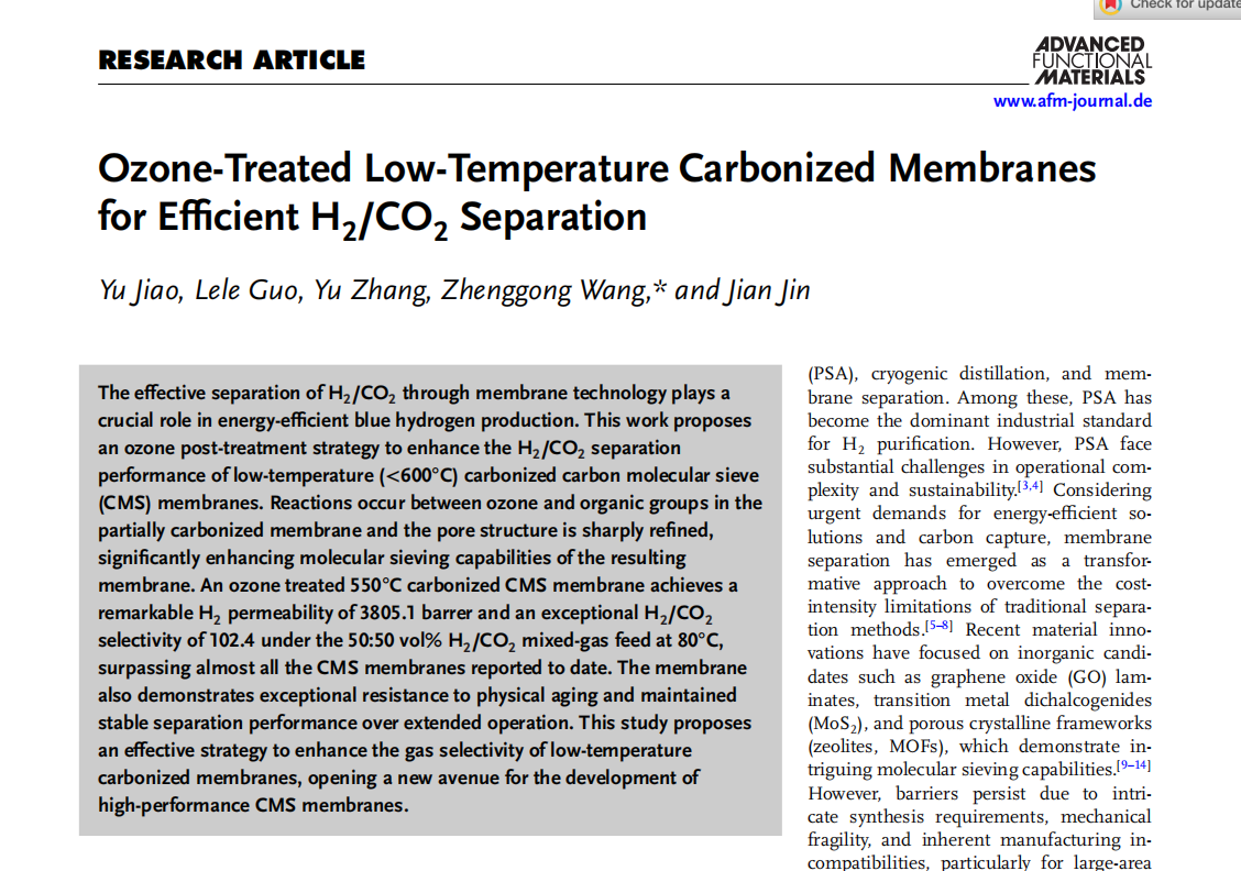 近日,苏州大学靳健教授、王正宫副教授课题组提出了一种创新的臭氧后处理策略,显著提升了低温碳化碳分子筛膜的氢气/二氧化碳分离性能。研究团队通过在550°C以下进行碳化并结合臭氧处理,使膜内孔结构得到精细调控,分子筛分能力大幅增强。该膜在混合气体测试中表现出卓越的氢气渗透性(最高达3805.1 barrer)和选择性(102.4),远超现有报道的大多数碳分子筛膜,并具备优异的抗老化性和长期运行稳定性。相关论文以“ Ozone-Treated Low-Temperature Carbonized Membranes for Efficient H 2 /CO 2 Separation ”为题,发表在Advanced Functional Materials 上,论文第一作者为Jiao Yu。
